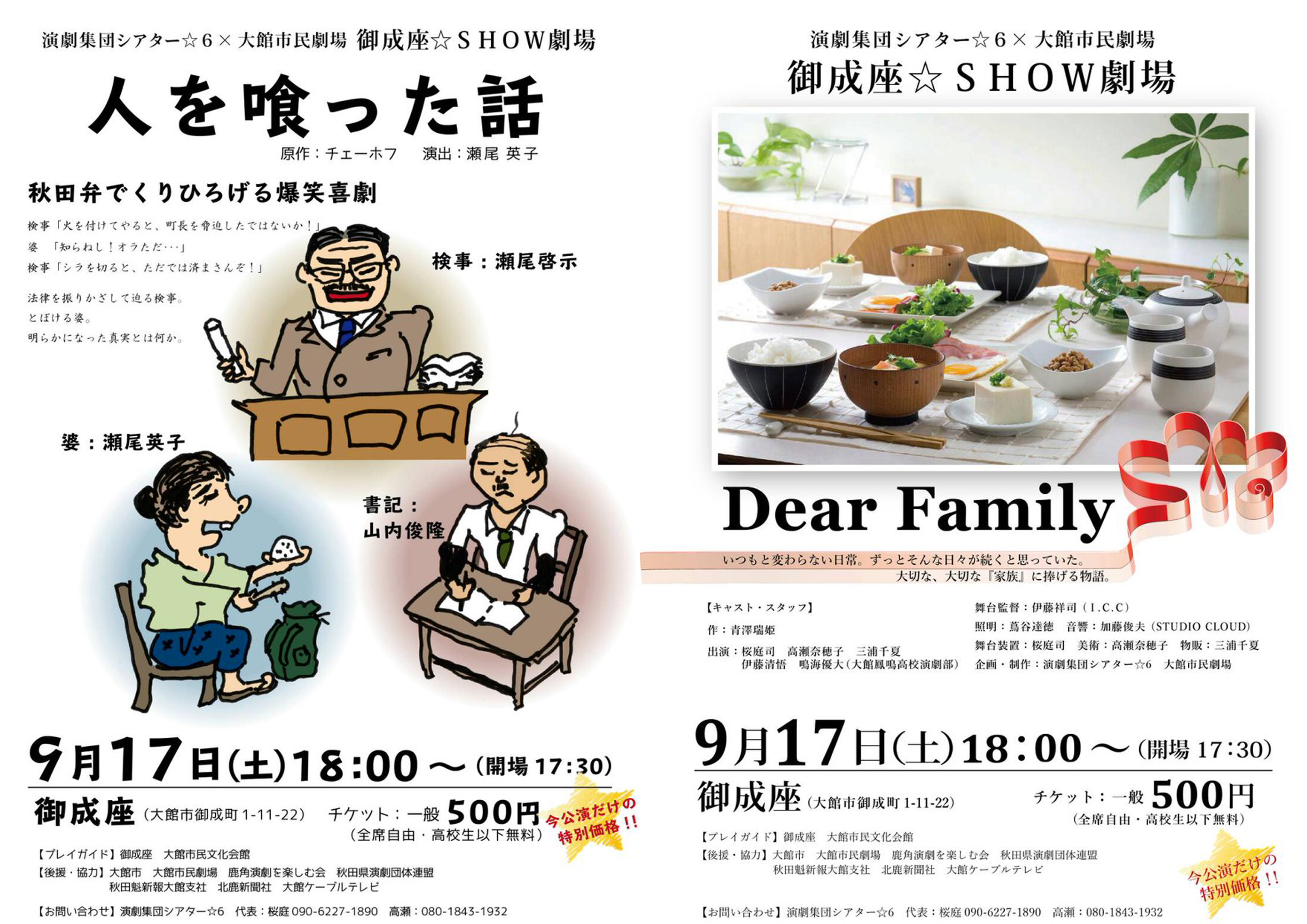 今週末の17日(土)に、演劇集団シアター6 × 大館市民劇場による演劇公演「御成座☆SHOW劇場」が開催されます。おトクな2本立て公演が、なんと今公演だけの特別価格500円!そして更に高校生以下は入場無料!チケットは現在御成座、大館市民文化会館で発売中!文化の秋、御成座で舞台芸術に触れてみてはいかがでしょう。