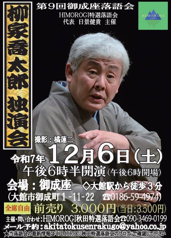 前売り券は御成座にて販売開始致しました。メール・電話予約は主催・HIMOROGI秋田特選落語会にて受付。(TEL:090-3469-0199/Mail:akitatokusenrakugo@yahoo.co.jp)