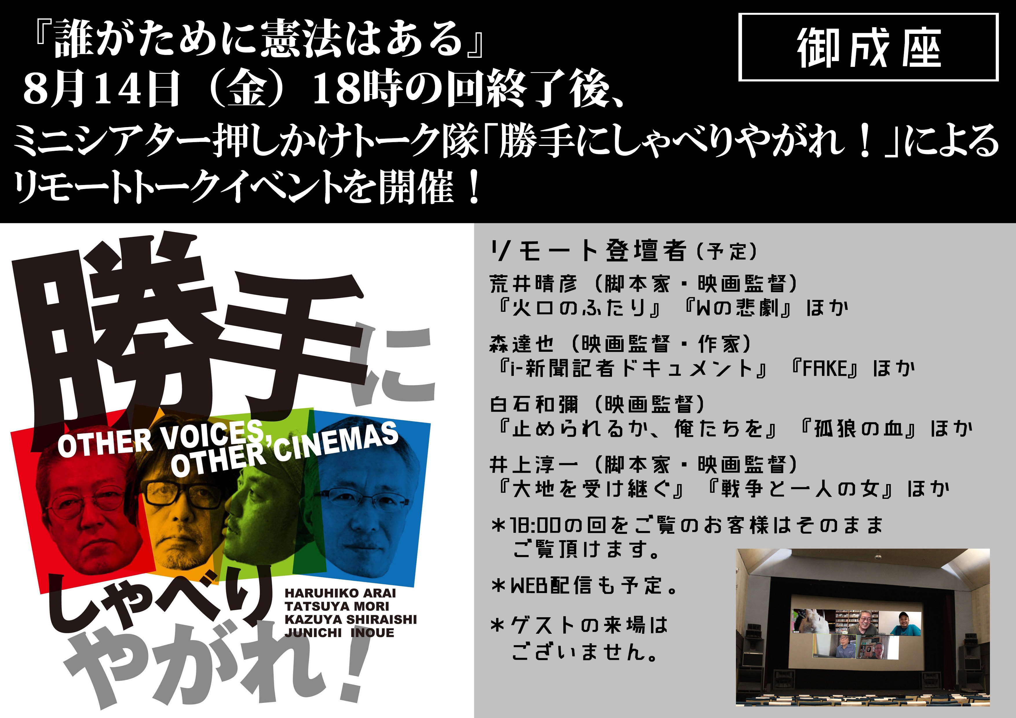 8月14日~8月16日の3日間限定で上映となる『誰がために憲法はある』の上映初日に、リモートでのトークイベントが開催されることとなりました。豪華4監督がリモートでどのようなトークを繰り広げるのか、ぜひ劇場でご覧下さい。*登壇者は会場にはお越しになりません。